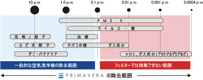 一般的な空気清浄機では除去しきれない空気中の細かな有害粒子も、独自技術の光触媒を搭載しているプリマヴェーラなら、分解・除去が可能です。空気中のウイルスや菌は格段に減少します。